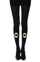 Opaque black 120 denier tights with gold print in the shape of a circle and inside there is a shape of a heart in the same color of the tights. The print is on both legs and can be worn either at the front or at the back part of the legs.