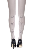 Fly high. The Paper Planes tights feature reversible origami-inspired bird graphics. You won't want to take these off. Colour: Light Grey tights with Black print. Thickness: 120 denier. Unless they have X-ray vision no one will be able to see through these opaque tights. Is the party in the front or the back? You choose with reversible tights where to place all the fun. Hand print no two are the same.