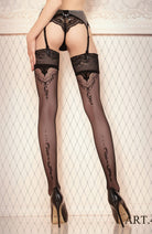 A truly gorgeous pair of Nero (Black) hold ups which feature a charming swirl pattern at the top of the leg and the calf. This pattern is found on the back of the legs as pictured the front is completely plain. The main leg of the hold ups is 20 denier and the pattern is 60 denier. An elegant lace trim band sits at the top of the hold ups with two individual silicone strips on the inside. This product is presented in luxury embossed packaging with a picture insert.