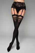 These black stockings with a bordeaux centre front seam and top of leg pattern are perfect for women who love the elegance of vintage styling with a modern twist. Whether dressing for a special occasion or adding a luxurious touch to your everyday look, these stockings will elevate your ensemble with ease.  Add these chic stockings to your collection today and step into refined elegance with every wear.
