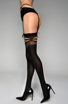 - Gold Centre Front Seam: A bold gold seam runs down the centre front of the stockings, creating a sleek, slimming effect while adding a touch of opulence.