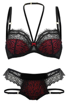 Sexy red and black bra made with black eyelash lace detail. Halter neck style strap detail which is fully adjustable (fixed to the centre of the bra so not removable) Fully adjustable shoulder straps with sold gold coloured metal fittings. Super sexy and unique!
