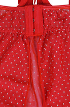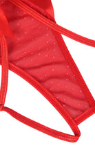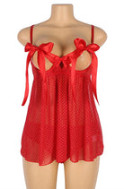 A sexy red and white polka dot babydoll with matching cage back brief.  This floaty little number is open busted with red ribbon bows. Item arrives packaged making it ideal as a treat or gift.