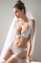A gorgeous suspender thong made from soft shiny and stretchy cotton. The front has exquisite scallop lacework embroidered onto mesh making Bliss absolutely divine. The back is completely plain. The waistband is elasticated providing extra stretch to fit the waist. Bliss is finished off with a pretty white ribbon bow on the front and a small diamante. Perfect design for bridal wear! Comes packaged in a Gracya box with lovely tissue paper. The suspender straps are detachable. This product is designed to match the B-162 bra.