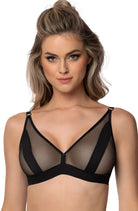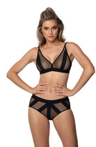 Meet your new favourite showstopper! This bra is sheer magic with its soft, see-through mesh and bold black lines that scream confidence. The triangle cups give it a chic, modern edge, while adjustable straps keep everything comfy and perfectly in place.  Versatile and stylish, this bra is all about effortless elegance with a modern edge.