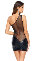 - Elegant black fabric with a glossy finish and sheer mesh inserts subtly accentuate the silhouette.